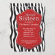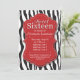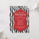 Estes convites adoráveis do doce dezesseis caracterizam um fundo preto & branco do impressão da zebra. Na parte superior é uma forma vermelha decorativa com uma beira branca. As palavras "doce dezesseis" são indicadas sobre os convites em uma pia batismal denominada. Personalize o convite com seus detalhes para a festa de aniversário na moda perfeita do doce 16!
