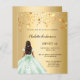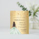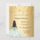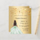 Um fundo com aspecto de ouro. Decorada com estrelas ouros e uma garota vestindo um vestido verde. Personalize e adicione um nome e detalhes. 1 folha = 1 convite impresso de borda a borda.