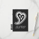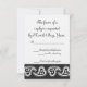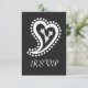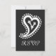 Essa elegante placa RSVP apresenta um fundo preto e um coração grande em forma de paisagem, cercado por bolinhas com uma vinha no interior, em branco na frente. Uma borda preta ao longo da borda inferior da placa com um padrão de corações brancos paisley decora a parte de trás com algum texto de amostra colocado acima que pode ser personalizado para ajustado de suas necessidades. Certifique-se de verificar os outros produtos no conjunto Doce Pintos em Preto para criar uma pesquisa verdadeiramente coordenada para o seu evento.