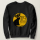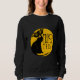 Gato negro já em máscara fica bonito na frente de uma lua amarela cheio. As palavras Trick ou Treat são colocadas de forma artística nesta forte design gráfica silhueta que lembra a arte moderna do século médio.