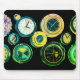 A collection of watch and clock faces on a computer desktop mousepad.