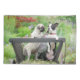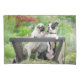 Dois cachorros bonitinhos, um filhote de cachorro mascarado preto e um jovem Boston Terrier, preto com marcas brancas, posando lado a lado e conversando juntos em um velho carrinho de madeira em um jardim. Foto fofa de cão, tirada por Katho Menden, este caso de travesseiro é uma ideia de presente encantadora para amantes de cachorros e animais de estimação.