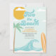 Dois na praia! O segundo aniversário Surfing Beach convida com ondas turquesas e conselho de surf laranja.