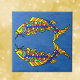 Este azulejo cerâmico decorativo tem um fundo azul profundo com dois peixes ricos abstratos de cor brilhante com escamas amarelas, laranja e azuis.
