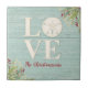 Um azulejo cerâmico com tema de praia com a palavra amor, e personalizado com seu nome embaixo. Uma concha de areia dólar cria o "o" na palavra amor. Esta porta copos tem um fundo texturizado de madeira e os cantos são decorados com gramíneas marinhas. Este azulejo cerâmico de areia é uma adição de excelente ao decoro da praia, e também faz um presente de excelente. Projetado para você pelo Blackberry Boulevard.