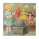 Um dia de Ocupação em Dollville - a ilustração da Pequena Vida da Menina A lavanderia Dolly foi originalmente um anúncio do Diamond Dyes de 1911. A menina loira tem um vestido azul adorável, enquanto ela está trabalhando no pote de corante vermelho e segurando o vestido de sua boneca sobre o corante quente. As bonecas estão no fundo, vendo a garotinha como se aprovasse um vestido novo! A trabalho de arte é feita pelo ilustrador Bessie Pease Gutmann, que era conhecido por seus filhos, animais e ilustrações frutas. Foi criado para Corantes de Diamante e colocado em placas e bandejas de estanho.