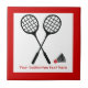 O azulejo cerâmico de Badminton, raquete e obturador mostra um ícone negro minimalista de duas raquetes de badminton, um vaivém e uma borda vermelha ao redor. Este design é um modelo e é completamente personalizável.