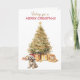 Na frente deste cartão de Natal, um adorável Cachorro de Lhasa Apso veste um chapéu de Papai Noel vermelho e branco e se senta em frente a uma árvore de Natal. A árvore é decorada em ouro, e pacotes de presentes correspondentes estão embaixo dela. O texto vermelho e dourado diz "Desejando-lhe um NATAL MERRY". Campos de texto dentro que você pode personalizar para qualquer coisa que quiser. Certifique-se de ver os outros cartões temáticos Lhasa Apso e presentes em nossa loja.