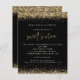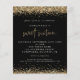 Dourada Glitter Doce 16 Convites de festas Pretos. Um alternativo MENOR de 4,5" x 5,6", compatível com o orçamento. Disponível em um STOCK de PLACA SEMI GLOSS 110 lb ou um STOCK de PAPEL THINNER SATIN FINISH 80 lb. Os envelopes são um extra opcional. As bordas de confete de falso ouro elegantes estão no topo e no fundo e também nas costas de um fundo preto clássico. Doce Dezesseis é colocado num estilo moderno de caligrafia. Personalize facilmente o resto do texto para você.
