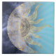 Um universo místico, nebuloso, nebula, lua de ouro e raios ondulantes solares mandala, design celestial, com palco crescendo brilhante com flores mandala e estrelas da galáxia azul-escuro, pontos, círculos, formas geométricas, e raios ondulantes mandala, flores e folhas de arte de rabiscar, feitas com um falso amarelo textura dourada, e fundo azul do céu à luz do dia. Esta bela, mística, lua fofa e tema do universo ao estilo sunna mandala, obra de arte original é perfeita para decoração domiciliar, visto diário, ocasião especial ou decorações de temas.
