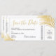 Design de folha de folha de folha de folha de folha de folha de ouro moderna, elegante e simples num destino de praça tropical de moda e divertida salve o cartão de ponto que parece um bilhete de passagem de avião. Todas as partes do nosso modelo de bilhete de avião chic são editáveis para que você possa criar uma para se adequar às suas cores de casamento e ao seu tema. Há espaço para adicionar detalhes de viagem no verso, ou apagar o design no verso se os detalhes ainda não estiverem prontos, você pode adicionar uma foto ou seu próprio monograma de casamento usando o designer avançado, basta clicar em 'personalizar mais'.