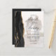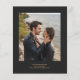 Este elegante design de casamento apresenta uma foto vertical do casal amolecida com uma tela branca para destacar a camada de texto. A borda esquerda apresenta uma borda preta de aquarelas aparada com falso brilho dourado. O texto preto personalizável combina escrita manual, impressão e fontes itálicas. Substitua facilmente a imagem de exemplo no verso por uma segunda foto vertical e adicione uma breve mensagem com informações adicionais, como o URL do site do seu casamento.