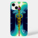 Elegante, artístico.classy caduceus com serpentes ouros entrelaçadas, asas azuis e pedras gema ametista 3D, luzes vibrantes e ondas fractais em turquesa, azul-aqua, azul-lacaio, turquase, violeta, amarelo, cores brancas.Caduceus é símbolo da astrologia grega antiga, medicina e cura, ceto de Hermes mensageiro de deuses e divindade do sinal zodiacal Gemini. design de joias legal, modelagem e renderização por parte da Búlgara Lumini (c).Visite nosso site em: www.webalice.it/baldesign3d crio e comprar produtos personalizados na Zazzle