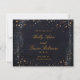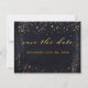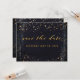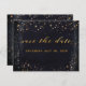 Um convite de casamento preto e dourado Salve o cartão de Data com uma cor d'água preta pintada de fundo com espinhos de tinta dourada, lembrando um céu noturno em meio a estrelas de ouro cintilante. Uma caligrafia clássica em inglês dourada para os seus nomes com pequenas letras de blocos para os detalhes.