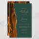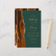 A borda esquerda deste elegante convite de casamento moderno e multifuncional de orçamento apresenta uma cor de água queimada, laranja e ferrugem, aparada com brilho dourado. O texto personalizável combina manuscritos dourados, placas de impressão e fontes itálicas em um fundo verde esmeralda. O design de agato laranja queimado também aparece na parte traseira da placa.