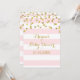 Convites personalizados para bebês em padrão de listras brancas e cor-de-rosa com confete dourado; note que ouro é efeito fotográfico apenas.