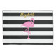 Esta fronha preta e branca tem um padrão de listras horizontais. Você pode personalizar o travesseiro com seu texto personalizado, como seu nome no script dourado faux (não foil). Um flamingo cor-de-rosa está sob o texto.