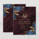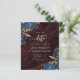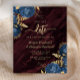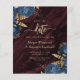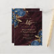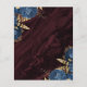 Este elegante casamento salve o cartão de data com buquês florais azuis marinhos disparados com verde folha de ouro em dois cantos, em uma imagem de fundo de um agate de cor d'água burguny. O texto personalizável combina fontes de serifa, itálico e escrita manual douradas. O verso apresenta um design floral e agate correspondente.
