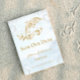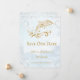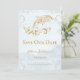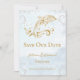Personalize um anúncio de casamento único com um Dourado Golfinho Salve a Data. O design de lançamento apresenta um golfinho metálico estilizado contra um fundo de ondas do oceano silenciadas adornado com rolhas elegantes e texto que você pode personalizar com seus detalhes de data de casamento. Salve ainda o anúncio de data disponível para este design em várias cores.