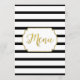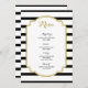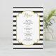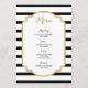 Menu janto de casamento em um padrão elegante de listras brancas e pretas e detalhes dourados, personalizável com seus detalhes e disponível em produtos de casamento correspondentes.