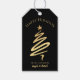 Uma etiqueta de presente elegante para os Feriados, com um design de árvore de Natal estilizado em ouro sobre fundo preto com seus textos personalizados.