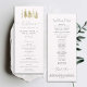 Alguns esboços de árvores de inverno empunhados com estrelas (Natal, ou simplesmente feriados), colados digitalmente com ouro, decoram este elegante, preto e branco e ouro, um programa simples, clássico e moderno de cerimônia de casamento que é perfeito para um casamento no inverno, perto ou no Natal ou em qualquer momento durante as férias. Apresenta caligrafia moderna e elegante com amplos florescimentos. Luxuoso, mas simples, clássico, mas chique, moderno, mas eterno. Uma escolha encantadora para um casal se casar nos frios meses de novembro, dezembro e janeiro e que gosta da estética da arte negra e branca para a papelaria do casamento, preto e branco e folha de papel, elegância botânica e árvores de inverno.