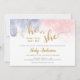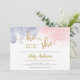 Este gênero horizontal revela um convite de festas que apresenta um texto de caligrafia dourado faux glitter sobre um fundo de cor azul-rosa e azul-escura. Personalize este convite divertido e moderno com as informações sobre o seu gênero.