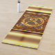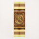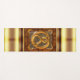 Possui um pretzel ouro em uma armação de madeira marrom e ornamentado. Colocado sobre um fundo de matizes ouros e castanhos.