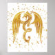Dragão Dourado nas estrelas Poster sobre fundo branco - Em uma sala escura, uma luz de solteiro ilumina um magnífico dragão de ouro enquanto voa majestosamente nas estrelas. Impresso contra um pano de fundo branco puro, este poster é uma adição etérea a qualquer parede. Perfeito para qualquer um que ama dragões, esta poster é certamente capaz de trazer encanto para sua casa.