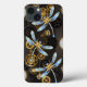 Marcadores e teclas antigas com engrenagens de ouro e latão, decoradas com libélulas mecânicas e boias em fundo castanho e listrado.