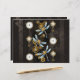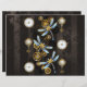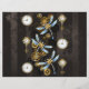 Marcadores e teclas antigas com engrenagens de ouro e latão, decoradas com libélulas mecânicas e boias em fundo castanho e listrado.