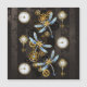 Marcadores e teclas antigas com engrenagens de ouro e latão, decoradas com libélulas mecânicas e boias em fundo castanho e listrado.