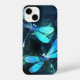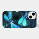 Duas libélulas transparentes, luminosas, turquesas, desenhadas artisticamente sobre fundo noturno, com algas e vagalumes luminescentes do lago. Dragonfly brilhante.