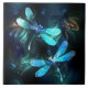 Duas libélulas transparentes, luminosas, turquesas, desenhadas artisticamente sobre fundo noturno, com algas e vagalumes luminescentes do lago. Dragonfly brilhante.