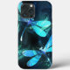 Duas libélulas transparentes, luminosas, turquesas, desenhadas artisticamente sobre fundo noturno, com algas e vagalumes luminescentes do lago. Dragonfly brilhante.