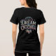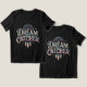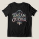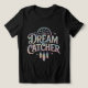 Esta camiseta apresenta uma design de caçador de sonhos com caracteres holográficos iridescentes. O texto DREAM CATCHER é escrito em uma fonte de script elegante e fluente com um efeito gradiente que transita de rosa para azul para roxo. As letras têm uma qualidade etérea translúcida e com um brilho arco-íris. Acima do texto está uma teia de sonhadores com padrões geométricos e um centro em forma de flor. Três penas decorativas pendem do fundo da caçadora de sonhos, coloridas em tons pastéis de rosa, azul e verde. Pequenos elementos decorativos como estrelas estão na design, particularmente perto dos cantos superiores. A design tem uma estética mística boêmica. A camiseta é uma camiseta preta Tri-Blend da Canvas Bella feminina.
