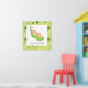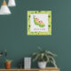 Uma poster para decorar a parede do berçário! Ele tem uma ilustração de dois bebês com pacificadores na boca dormindo pacificamente em uma vagem verde como se fosse como uma rede. Ao redor da borda há um padrão de círculos com paleta colorida de verde e amarelo. O texto diz "Duas Ervilhas em um Pod".