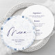 Celebrate the bride-to-be with this elegant dusty blue floral bridal shower menu. Designed in a soft blue and white watercolor style, this round menu card features delicate florals and refined typography, perfect for a garden, brunch, or tea party bridal shower. The front showcases a graceful floral design with the event title, while the back displays a customizable menu layout for appetizers, entrées, and desserts. Easily personalize with the bride’s name, date, and menu details to create a cohesive and stylish bridal shower table setting.
