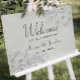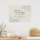 Bem-vindos convidados para o seu dia especial com este elegante cartaz de casamento azul. Apresentando um fundo pastel macio com ilustrações florais de prata detalhadas e caligrafia graciosa, é a combinação perfeita de encanto moderno e romance clássico. Totalmente personalizável com nomes e data.