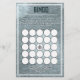 Este cartão de chá de fraldas do bebê rapaz apresenta um belo, mas ousado design. Suas regras de bingo aparecem no centro superior usando uma fonte antiga no estilo mundial. Ele diz "BINGO" como a manchete principal. O plano de fundo apresenta um design azul ondulado de textura falsa com estilo vintage, trabalho de arte de rolagem moldando a placa na parte inferior. Estas cartas revertem apenas para o fundo azul empoeirado de textura falsa com as palavras "Obrigado!".