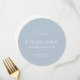 Elegant round wedding menu featuring a soft dusty blue background and modern minimalist typography.