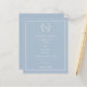 A dusty blue colored background decorated with a hand drawn crest, wreath. Soft ivory colored frames and text. Personalize and your monogram initials, names and details.