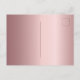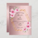 Um convite para o casamento tropical de verão elegante. Com uma falsa estrutura geométrica de ouro decorada com hibisco de rosas claro, flores tropicais com um pouco de verde. Um fundo metálico rosado e sujo. Os primeiros nomes da noiva e do noivo são escritos com um moderno roteiro de estilo. Texto preto. Traseira: fundo metálico rosado e rosado. Dica: Se você não quiser que pareça um cartão postal, clique em personalizar, vá para o verso e remova o divisor e o carimbo de posto.