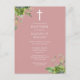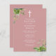 Este elegante cartão-postal de batismo cor-de-rosa botânico poeirento e eucalipto verde, batizante de batismo poeirento, pode ser personalizado com sua informação em tipografia quic com iniciais de monograma no reverso. Projetado por Thisnotme©