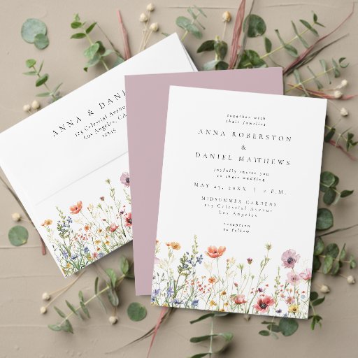 This collection features a border of elegant, rustic wildflowers in tones perfect for casual spring and summer boho-themed weddings.