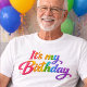 Fonte brilhante e colorida de arco-íris com a inscrição "É o meu Aniversário" com confetes vibrantes e gradientes divertidos, para uma camisa alegre de “Festa de Aniversário” para o convidado de honra —perfeita para celebrações de marcos importantes.
