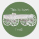 Esta diversão, é assim que eu rolo, adesivos, mostrando meu desenho de um vagão rústico. O vagão é desenhado em tons de cinza e chá marrom. O texto também é escrito em cinzas e pode ser personalizado com o texto. O fundo mostrado é verde e também pode ser personalizado. Obrigado por comprar CherylsArt no Zazzle.