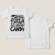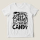 Esta design do Halloween apresenta a frase brincalhona "Witch Melhor Ter Meu Docinho" organizada em um layout dinâmico e de várias fontes. A palavra "Bruxa" é exibida em letras grandes e negrito, enquanto "Melhor" é escrita em um guião cursivo e fluente, acrescentando um senso de urgência e diversão ao design. A frase "Tenho o meu" está incluída em uma faixa, enfatizando ainda mais a demanda. A palavra "Candy" destaca-se no fundo em letras grandes, em bloco, com pequenas ilustrações do crânio integradas ao design. Elementos adicionais do Dia das Bruxas, como vassoura-bruxa, morcego, estrela e doces embrulhados, são espalhados pela composição, melhorando o sentimento assustador e festivo.