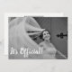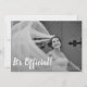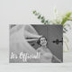 Este anúncio de casamento preto e branco é uma forma excelente de deixar seus amigos e familiares saberem que você fugiu, teve uma cerimônia secreta, ou um casamento privado. A frente do cartão foi projetada para mostrar sua foto de orientação horizontal favorita, com as palavras 'É Oficial!' na parte inferior esquerda, em um tipo de script branco e moderno. Seus nomes, data do casamento e local aparecem no canto inferior direito em uma fonte moderna, moda sans serif. A parte traseira da placa permite digitar uma saudação pessoal e também apresenta uma foto de orientação vertical/retrato em preto-e-branco. Este é um design de modelo e é muito fácil de personalizar para atender às suas necessidades. Foto e design copyright Anastasia Surridge, 2017.