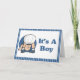 Um lindo menino de desenho animado vestido de azul com as palavras É um menino ao lado dele. Anuncie ao mundo a chegada daquele bebê muito especial. Carimbo de correio correspondente disponível.